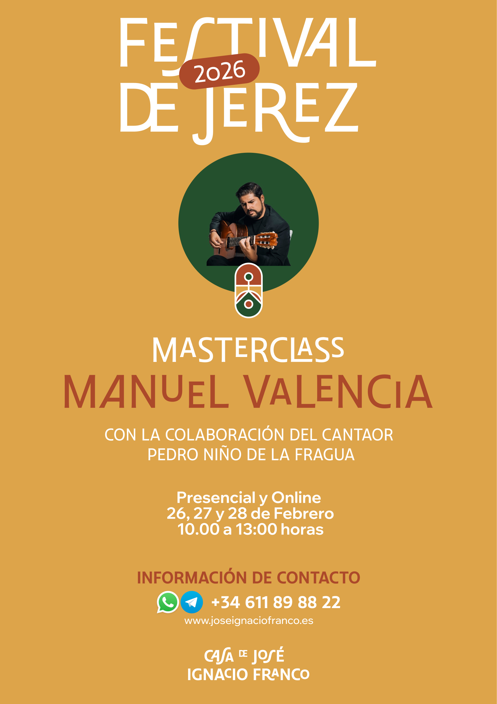 INCLUYE: 6 masterclass con GUITARRISTAS: José Ignacio Franco - Juan Diego Mateos - Manuel Jero, CANTAOR: Pedro Niño de la Fragua y el BAILE de: Saray Garcia (trabajando el acompañamiento al cante y al baile)
